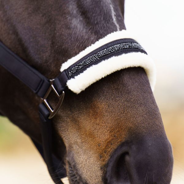 Grimen er fremstillet i blødt softshell-materiale og udstyret med faux fur polstring på næsebånd og bag ørerne for at sikre maksimal komfort og forebygge gnavesår. De skinnende rhinsten på næseremmen giver et eksklusivt og iøjnefaldende udtryk, der får din hest til at stråle.
