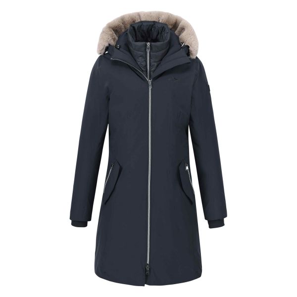 En af de unikke funktioner er den aftagelige inderjakke i et flot perleskinnende stof, som giver ekstra varme og kan bæres separat på mildere dage. 2-vejs lynlåslukningen foran gør det nemt at justere for komfort, mens ribkanter ved ærmerne og skjulte trykknapper i sideslidserne giver fleksibilitet og bevægelsesfrihed.