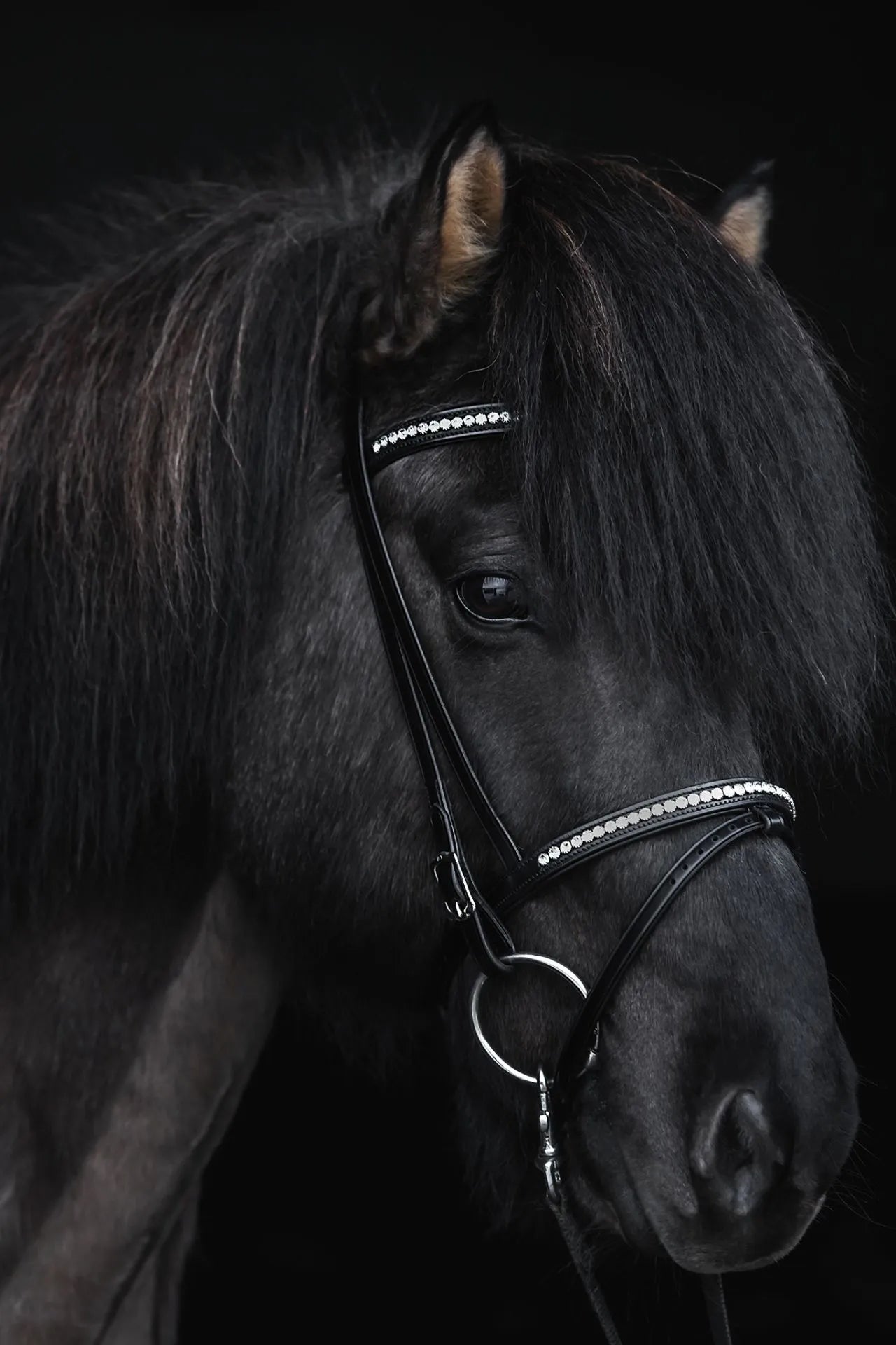 Engelsk kombineret næserem af høj kvalitet med funklende sten. Elegant design, der problemfrit tilpasser sig konturerne af hestens hoved.